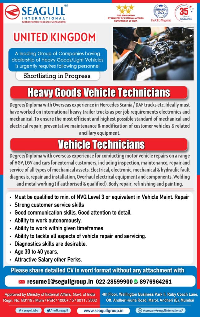 Degree/Diploma with Overseas experience in Mercedes Scania/DAF trucks etc. Ideally must