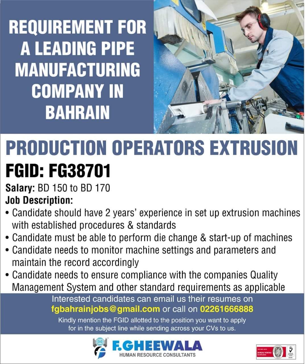 fgbahrainjobs@gmail.com or call on 02261666888