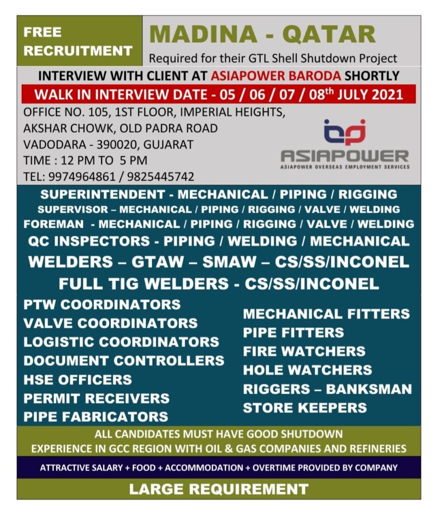 WALK IN INTERVIEW DATE – 05 / 06 / 07 / 08th JULY 2021