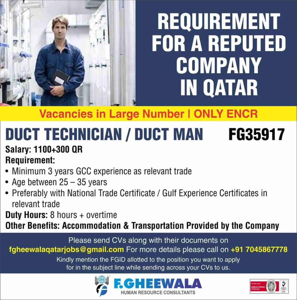 fgheewalaqatarjobs@gmail.com For more details please call on +91 7045867778