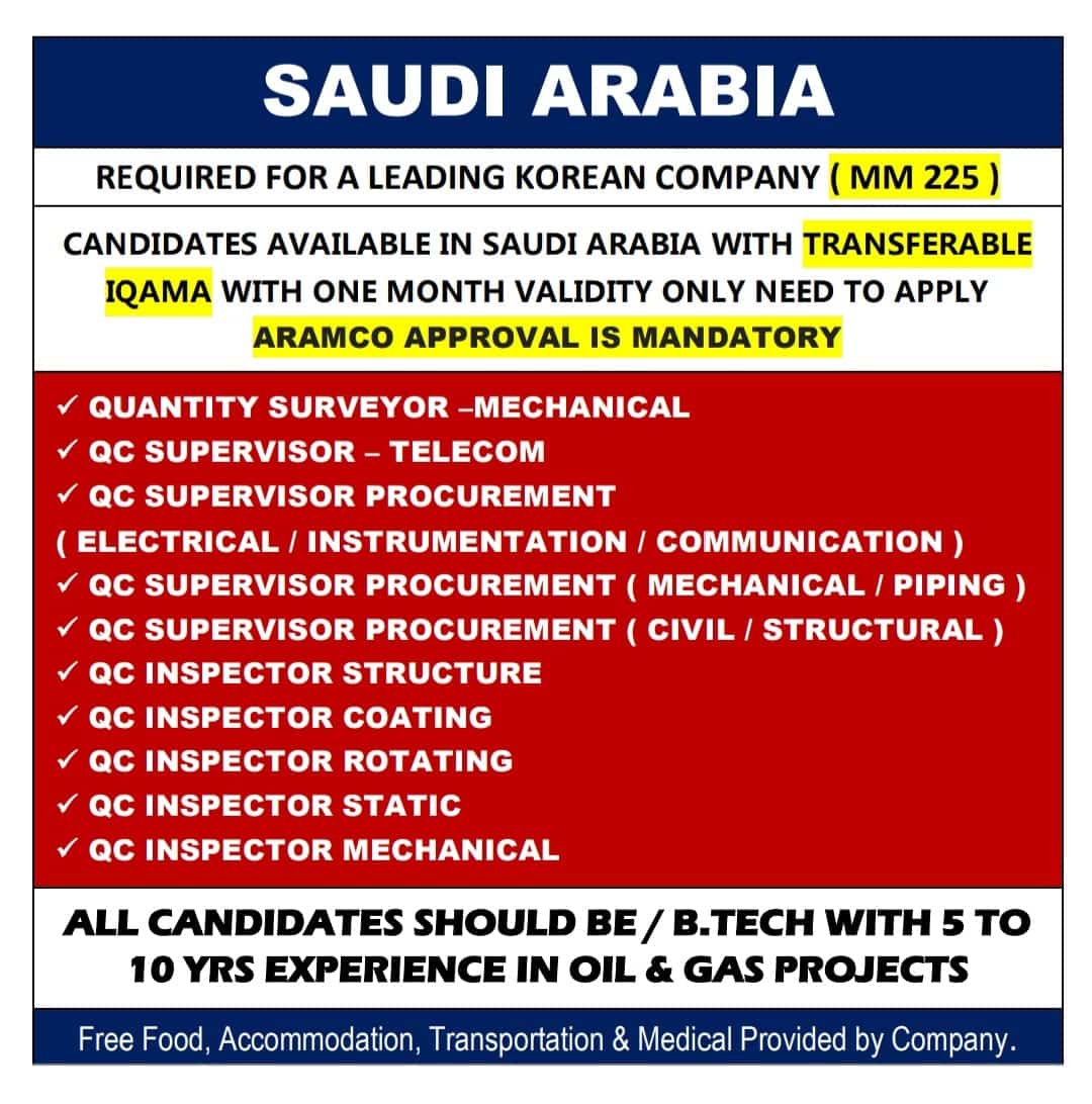 Free Food, Accommodation, Transportation & Medical Provided by Company.