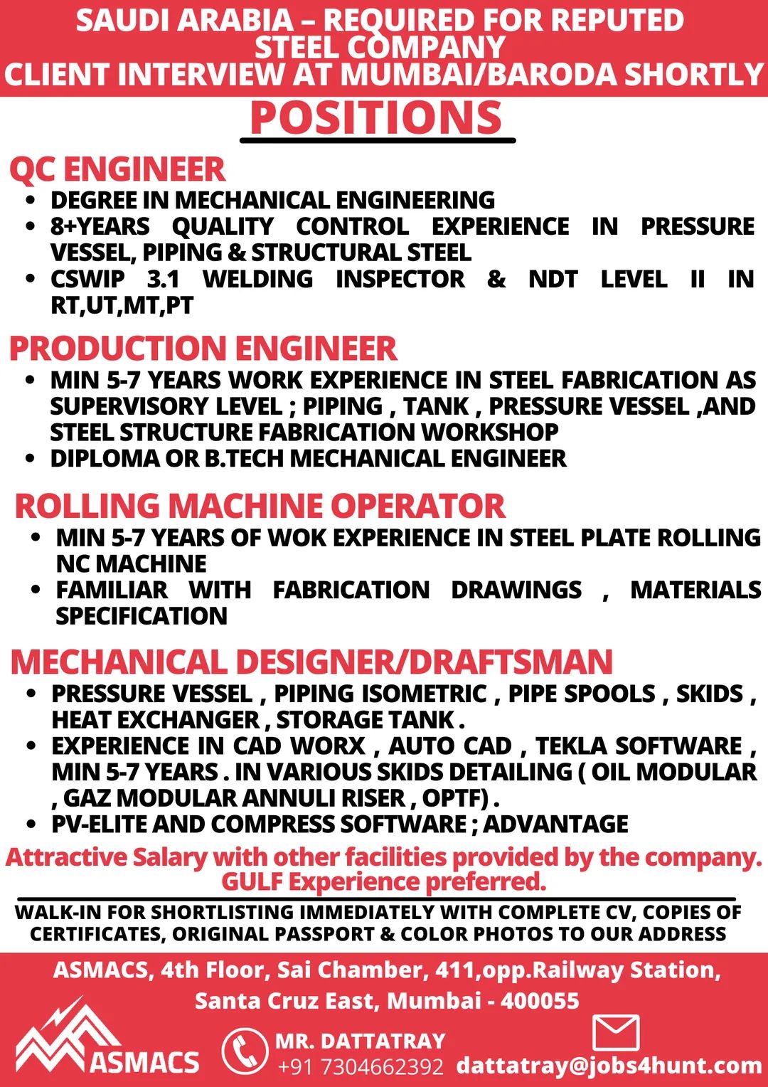 • MIN 5-7 YEARS WORK EXPERIENCE IN STEEL FABRICATION AS