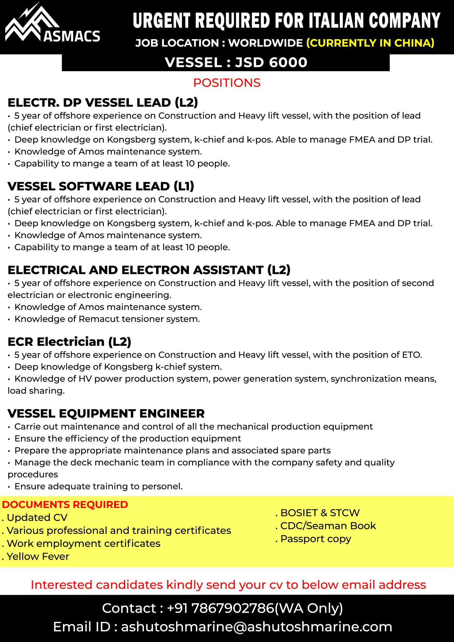JOB LOCATION: WORLDWIDE (CURRENTLY IN CHINA) VESSEL: JSD 6000