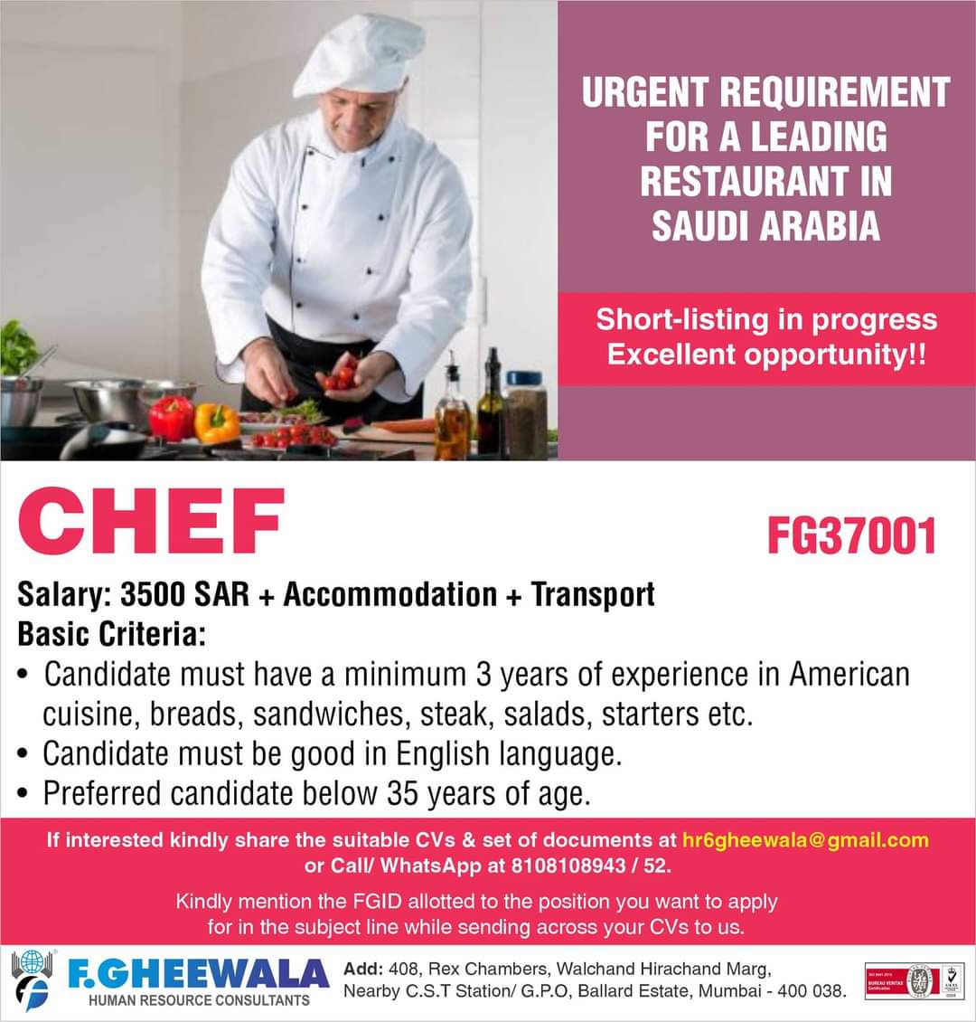 Salary: 3500 SAR + Accommodation + Transport