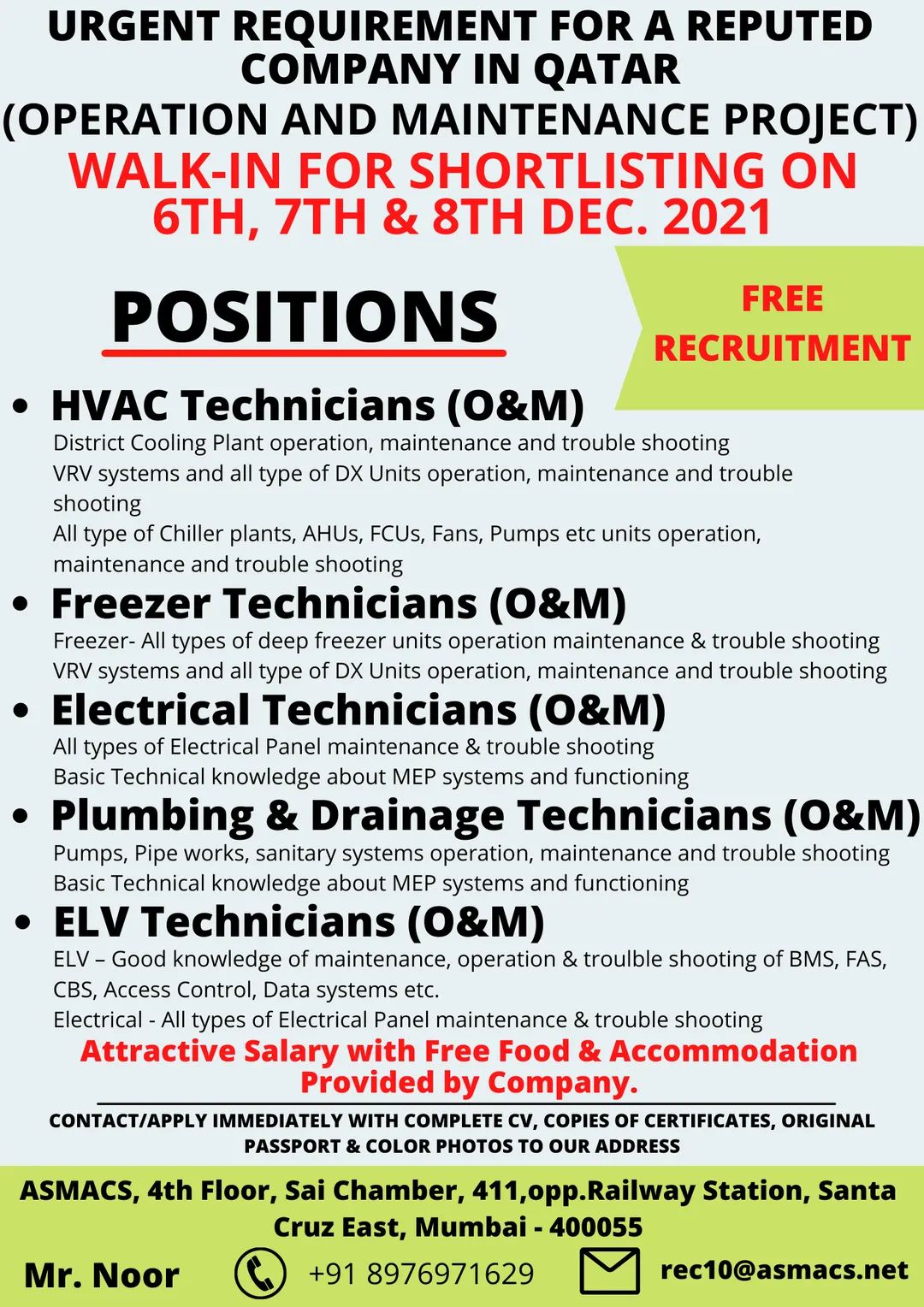 Attractive Salary with Free Food & Accommodation