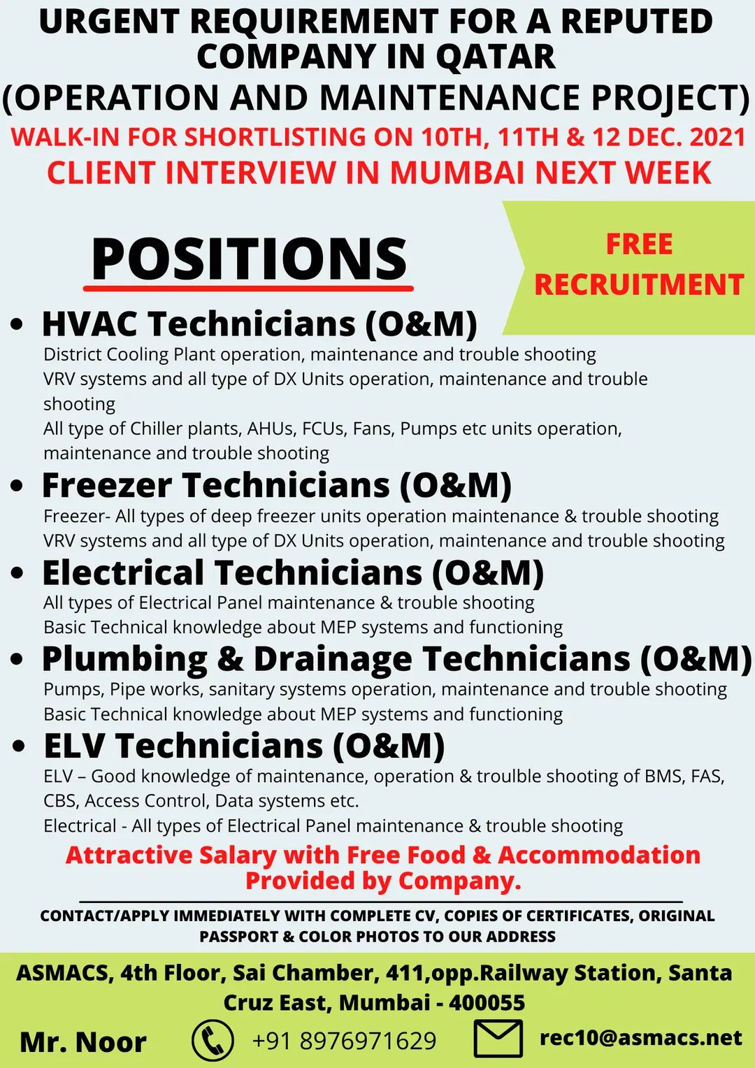 Attractive Salary with Free Food & Accommodation