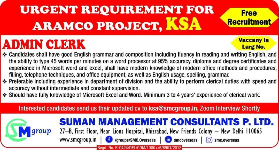 ARAMCO PROJECT, ADMIN CLERK Free