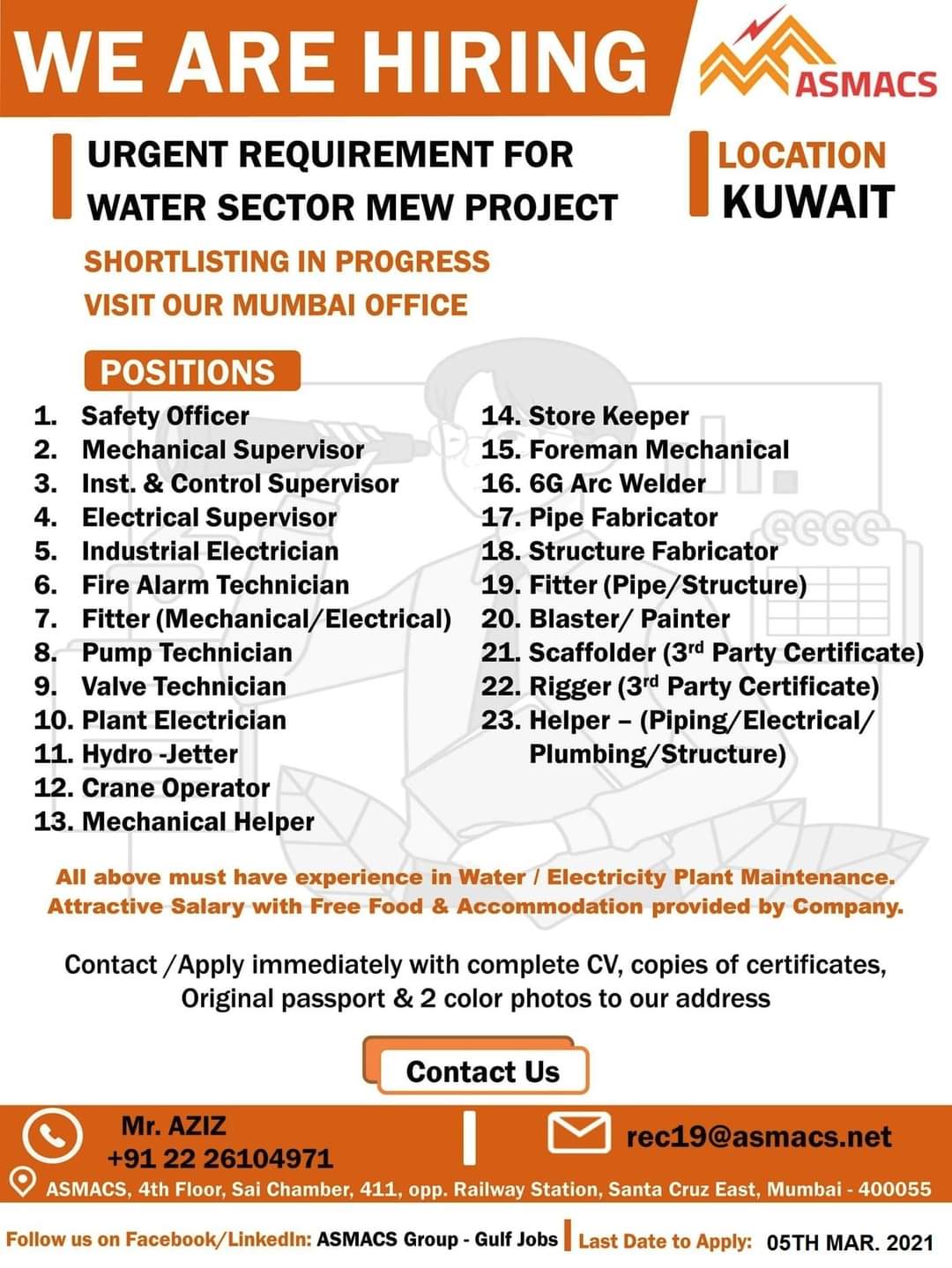 All above must have experience in Water I Electricity Plant Maintenance.
