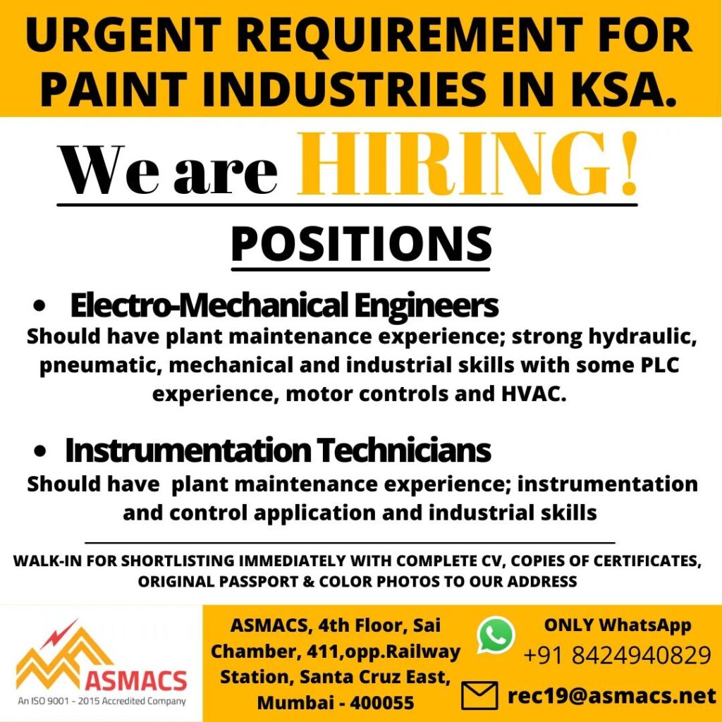 Should have plant maintenance experience; instrumentation
