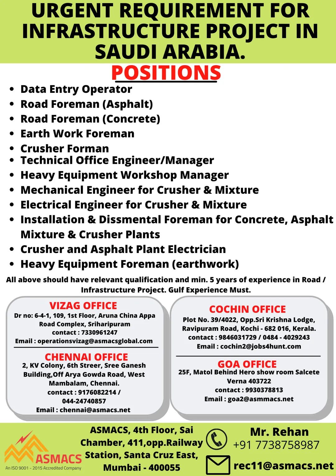 All above should have relevant qualification and min. 5 years of experience in Road /