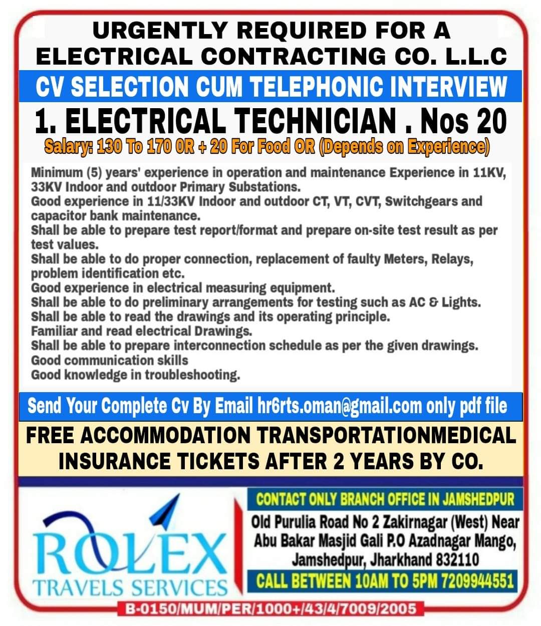 Minimum (5) years’ experience in operation and maintenance Experience in 11KV,