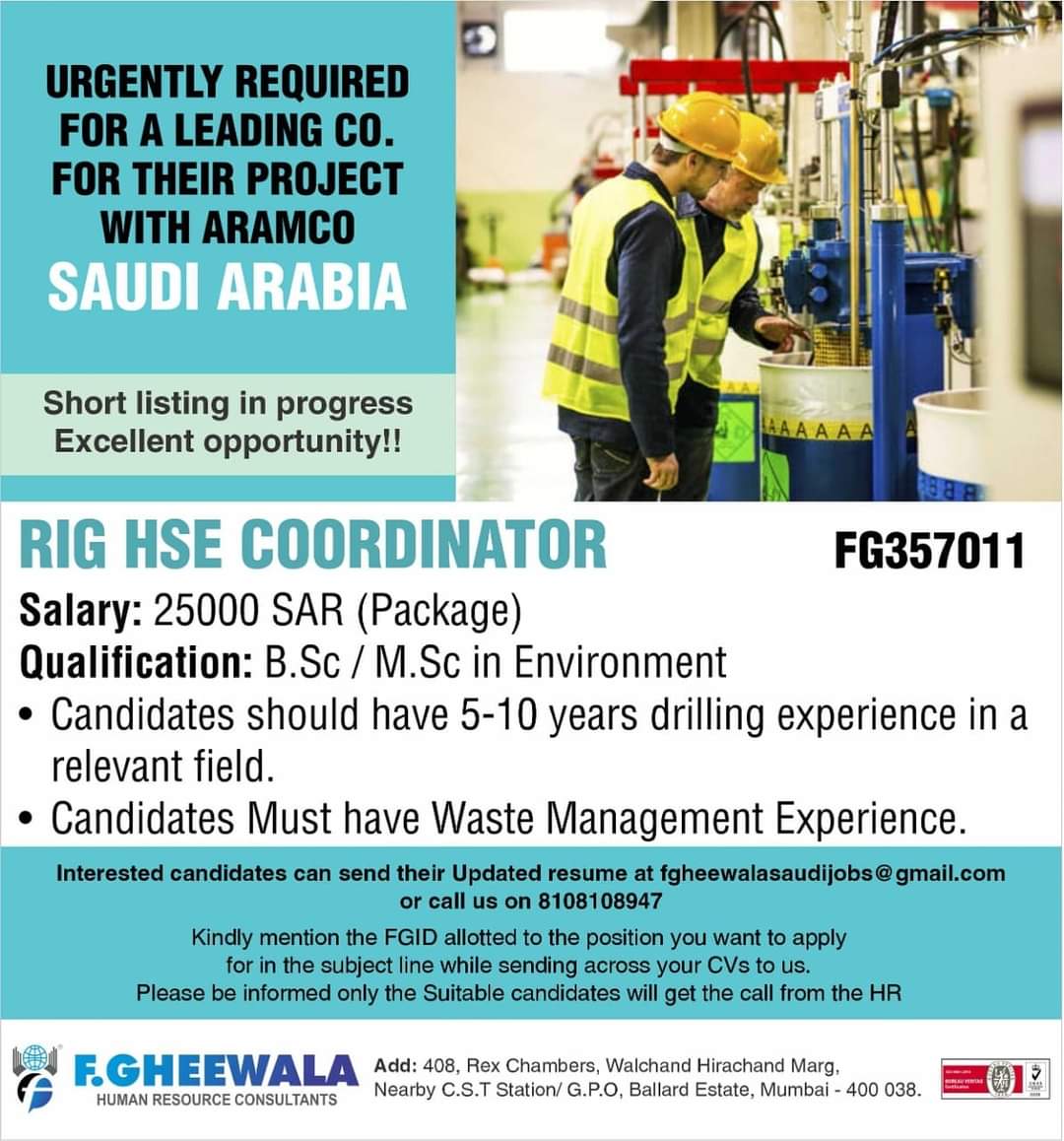RIG HSE COORDINATOR Salary: 25000 SAR (Package) Qualification: B.Sc / M.Sc in Environment • Candidates should have 5-10 years drilling experience in a relevant field. • Candidates Must have Waste Management Experience.