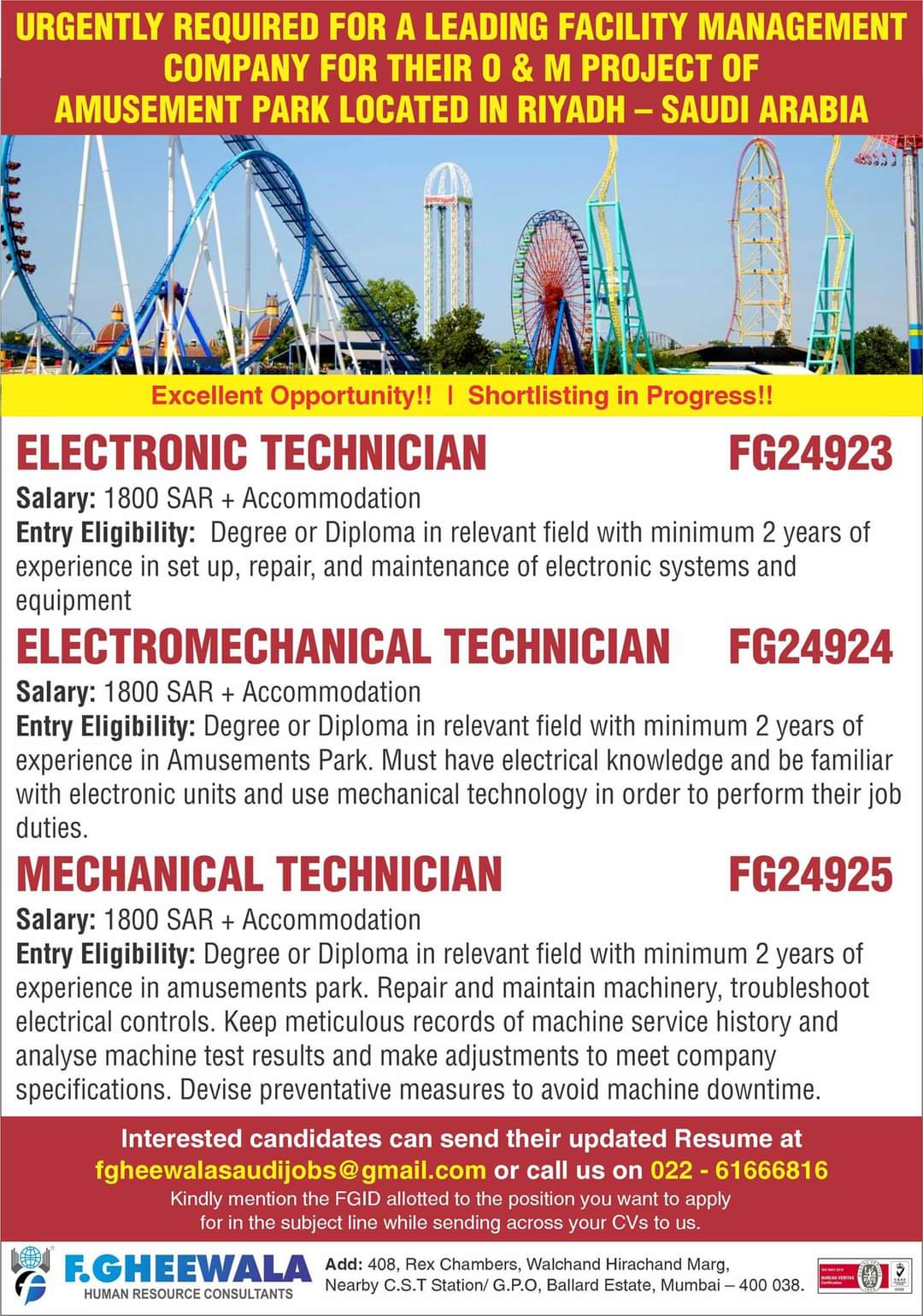 ELECTRONIC TECHNICIAN FG24923 Salary: 1800 SAR + Accommodation Entry Eligibility: Degree or Diploma in relevant field with minimum 2 years of experience in set up, repair, and maintenance of electronic systems and equipment ELECTRO MECHANICAL TECHNICIAN FG24924 Salary: 1800 SAR + Accommodation Entry Eligibility: Degree or Diploma in relevant field with minimum 2 years of experience in Amusements Park. Must have electrical knowledge and be familiar with electronic units and use mechanical technology in order to !perform their job duties. MECHANICAL TECHNICIAN FG24925 Salary: 1800 SAR + Accommodation Entry Eligibility: Degree or Diploma in relevant field with minimum 2 years of experience in amusements park. Repair and maintain machinery, troubleshoot electrical controls. Keep meticulous records of machine service history and analyse machine test results and make adjustments to meet company specifications. Devise preventative measures to avoid machine downtime.