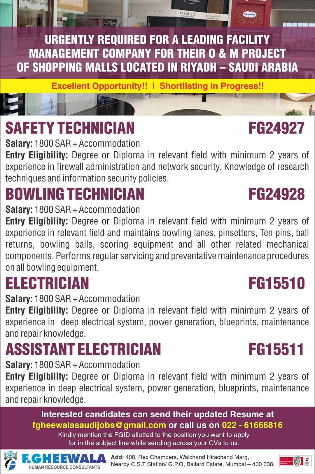 SAFETY TECHNICIAN FG24927 Salary: 1800 SAR + Accommodation Entry Eligibility: Degree or Diploma in relevant field with minimum 2 years of experience in firewall administration and network security. Knowledge of research techniques and information security policies. BOWLING TECHNICIAN FG24928 Salary: 1800 SAR + Accommodation Entry Eligibility: Degree or Diploma in relevant field with minimum 2 years of experience in relevant field and maintains bowling lanes, pinsetters, Ten pins, ball returns, bowling balls, scoring equipment and all other related mechanical components. Performs regular servicing and preventative maintenance procedures on all bowling equipment. ELECTRICIAN FG15510 Salary: 1800 SAR + Accommodation Entry Eligibility: Degree or Diploma in relevant field with minimum 2 years of experience in deep electrical system, power generation, blueprints, maintenance and repair knowledge. ASSISTANT ELECTRICIAN Salary: 1800 SAR + Accommodation Entry Eligibility: Degree or Diploma in relevant field with minimum 2 years of experience in deep electrical system, power generation, blueprints, maintenance and repair knowledge.