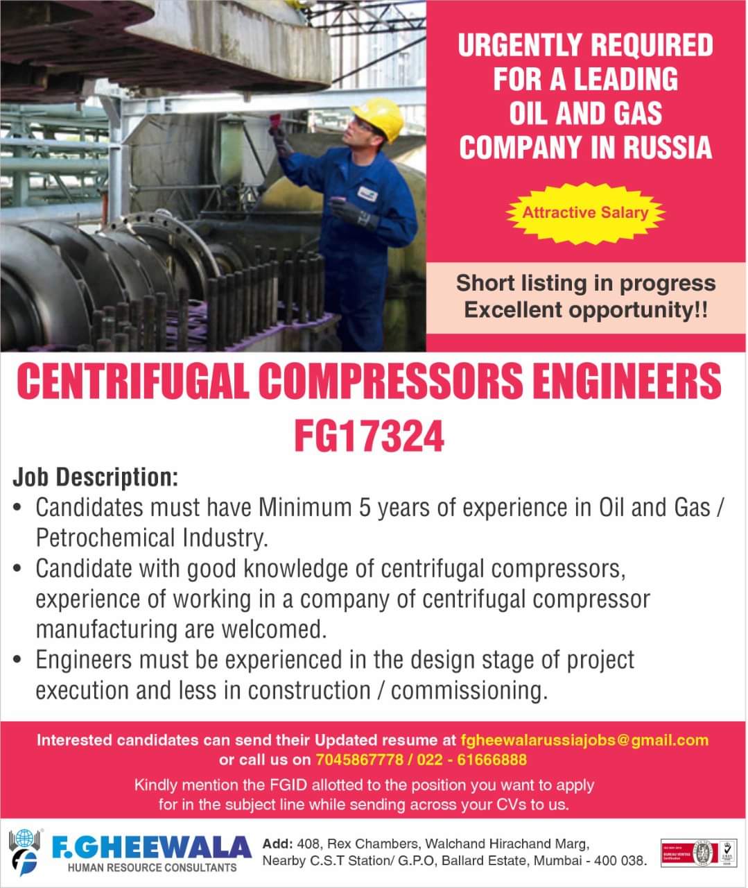Interested candidates can send their Updated resume at fgheewalarussiajobs@gmail.com or call us on 7045867778 / 022 – 61666888 Kindly mention the FGID allotted to the position you want to apply for in the subject line while sending across your CVs to us.