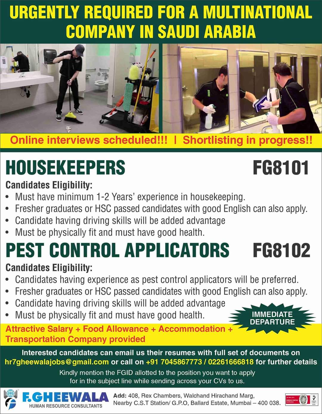 • Must have minimum 1-2 Years’ experience in housekeeping.