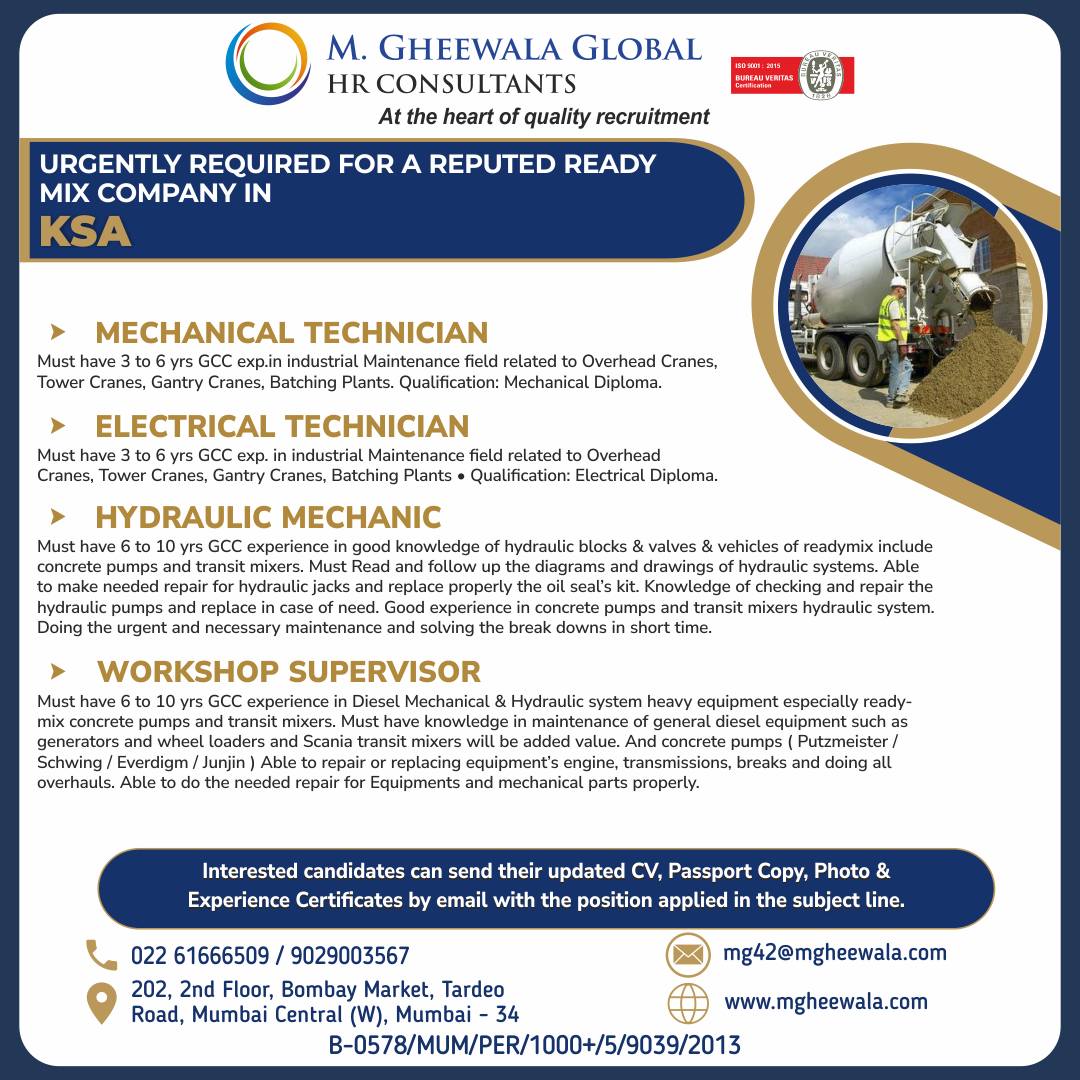 Must have 6 to 10 yrs GCC experience in good knowledge of hydraulic blocks & valves & vehicles of readymix include