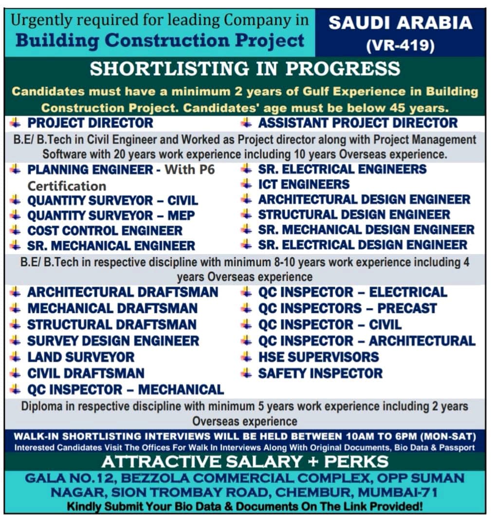 Construction Project. Candidates’ age must be below 45 years.