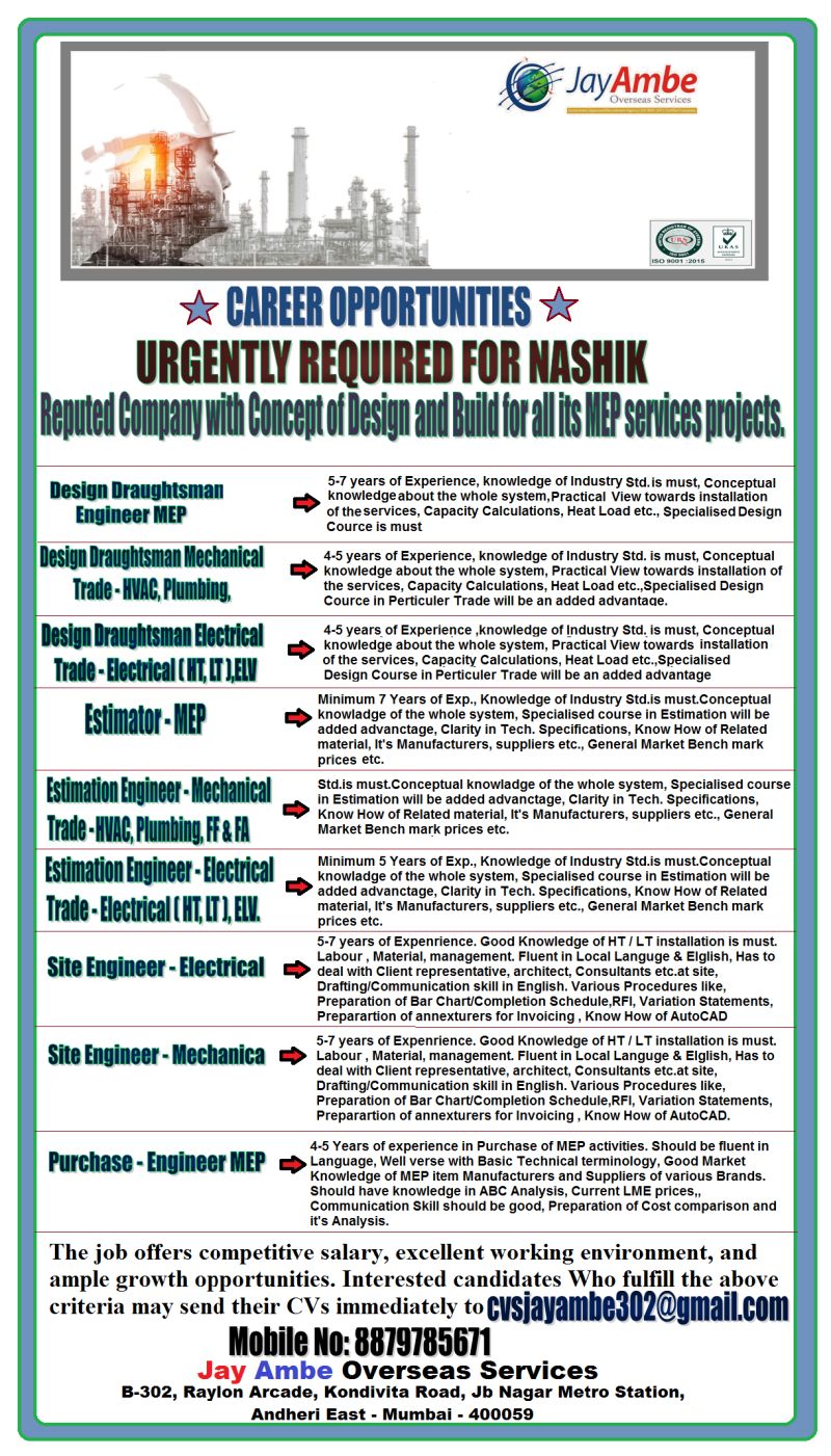 4-5 Years of experience in Purchase of MEP activities. Should be fluent in