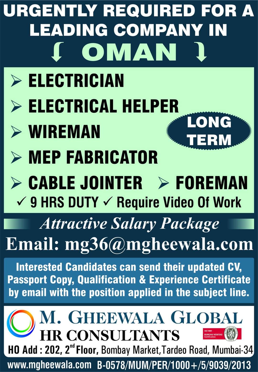 Attractive Salary Package Email: mg36@mgheewala.com