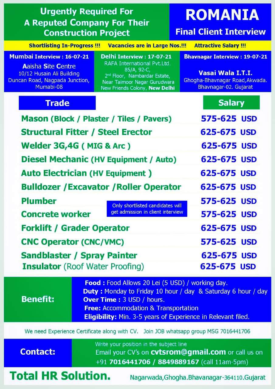 Urgently Required for ROMANIA