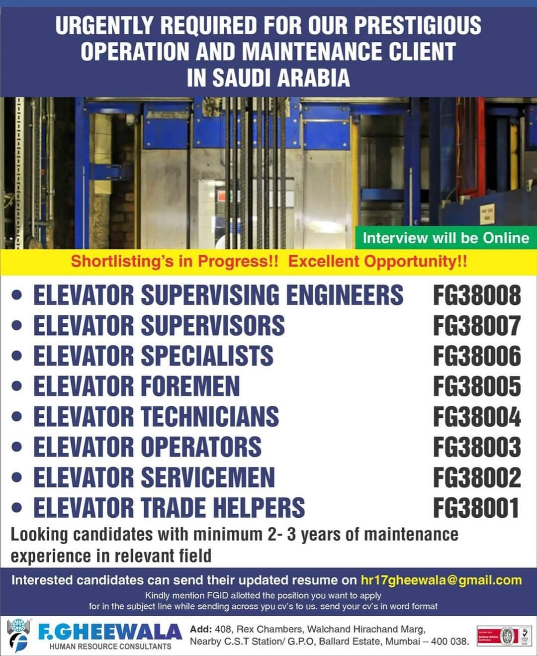 FG38001 Looking candidates with minimum 2-3 years of maintenance experience in relevant field Interested candidates can send their updated resume on hr17gheewala@gmail.com