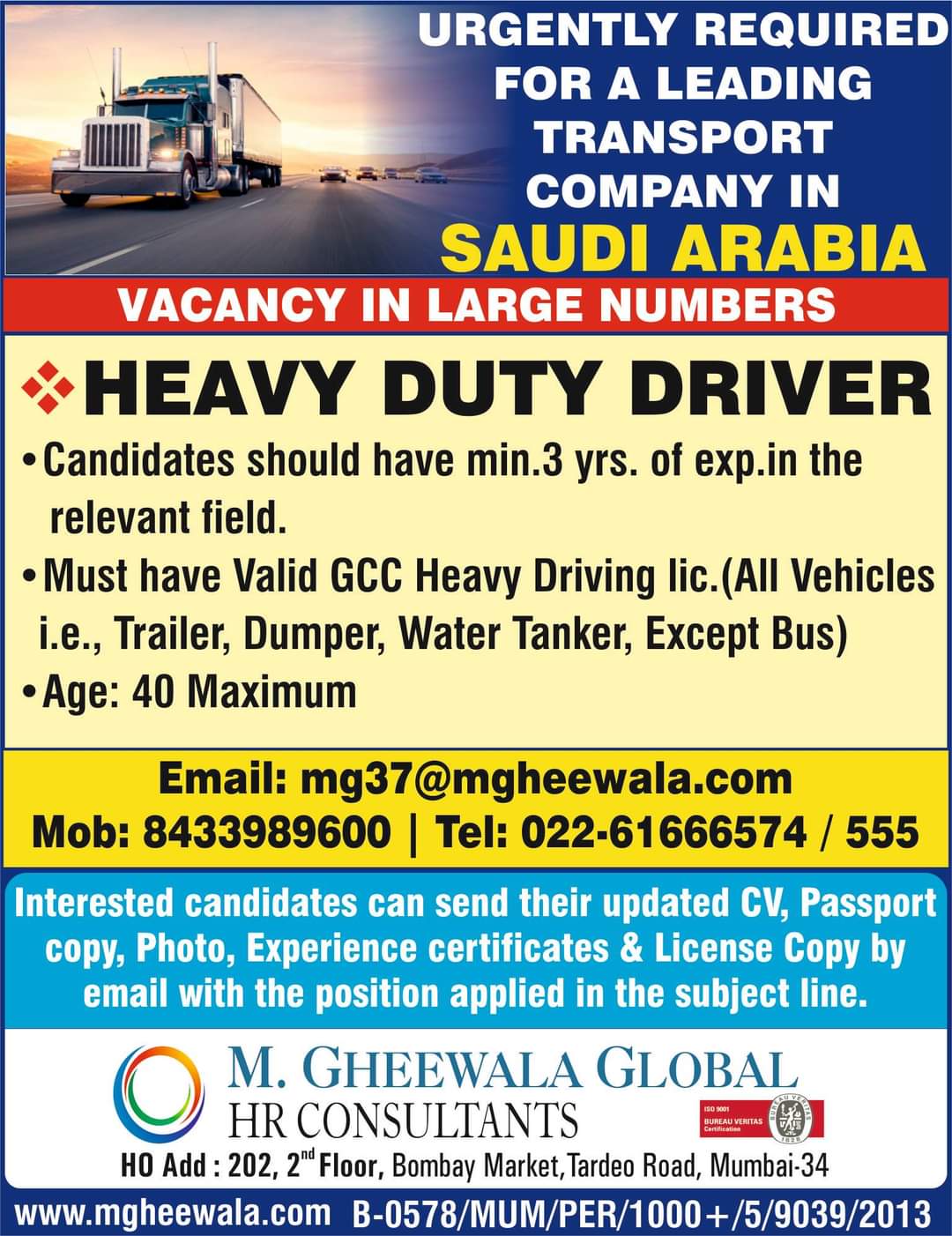• Must have Valid GCC Heavy Driving lic.(All Vehicles i.e., Trailer, Dumper, Water Tanker, Except Bus)