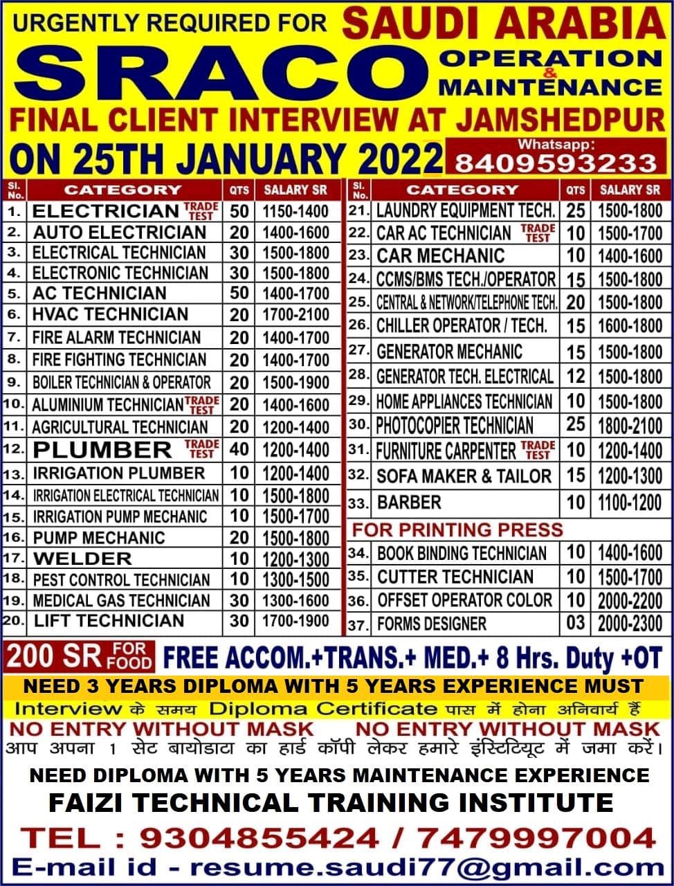 URGENTLY REQUIRED FOR SAUDI ARABIA