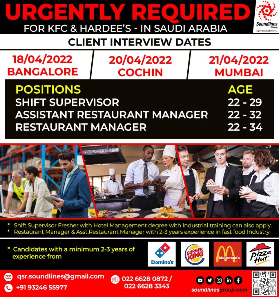 * Restaurant Manager & Asst.Restaurant Manager with 2-3 years experience in fast food Industry.