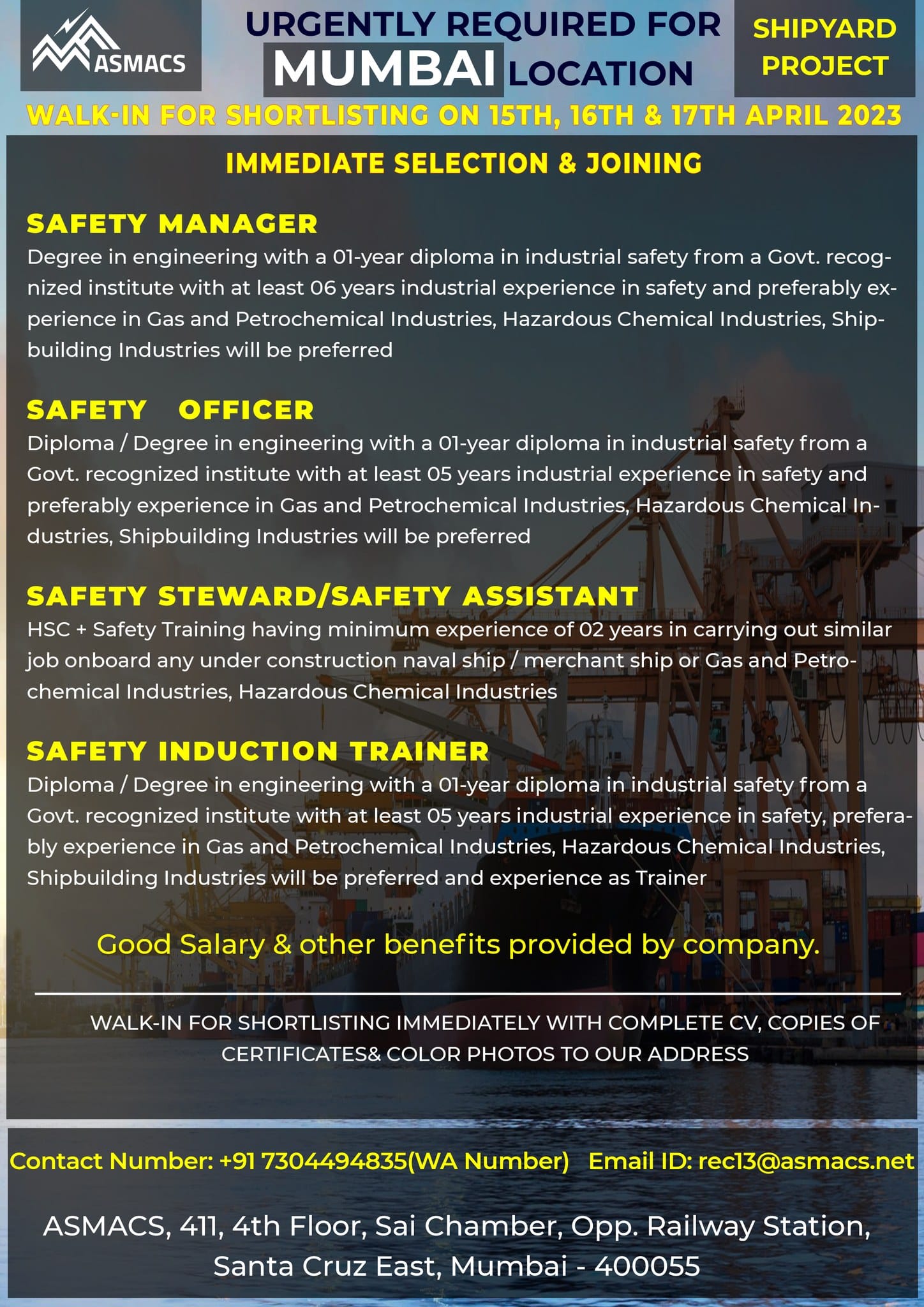 WALK-IN FOR SHORTLISTING ON 15TH, 16TH & 17TH APRIL 2023
