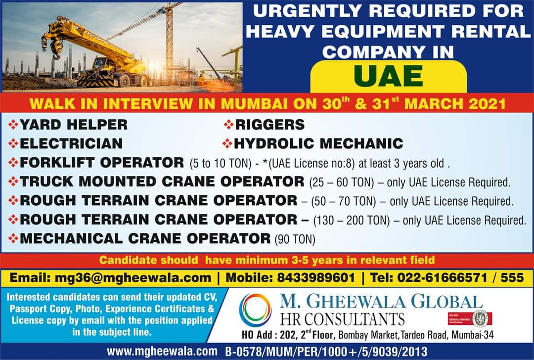 •TRUCK MOUNTED CRANE OPERATOR (25 – 60 TON) – only UAE License Required.