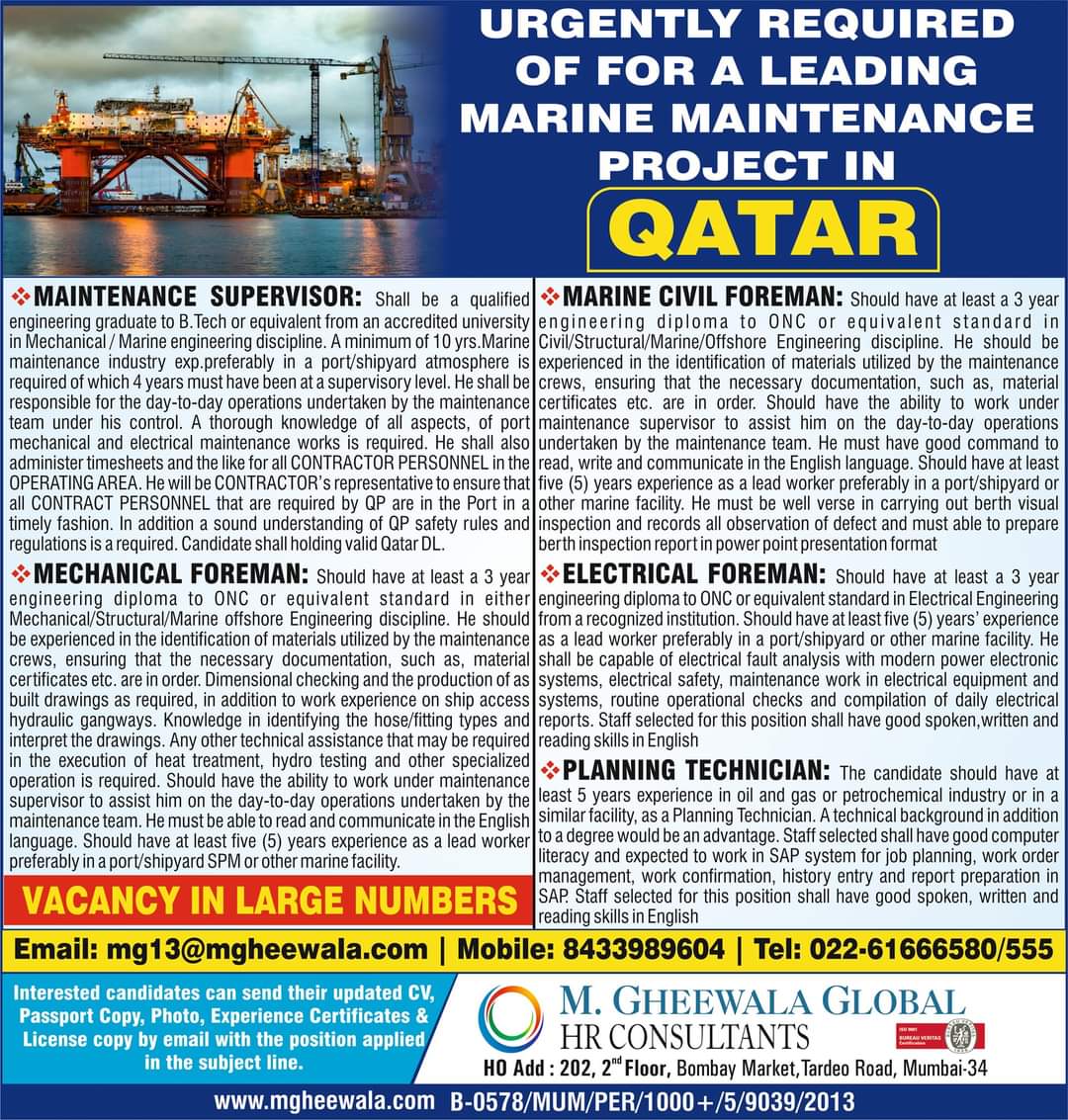 .MECHANICAL FOREMAN: Should have at a 3 year *ELECTRICAL FOREMAN: Should have at least a 3 year