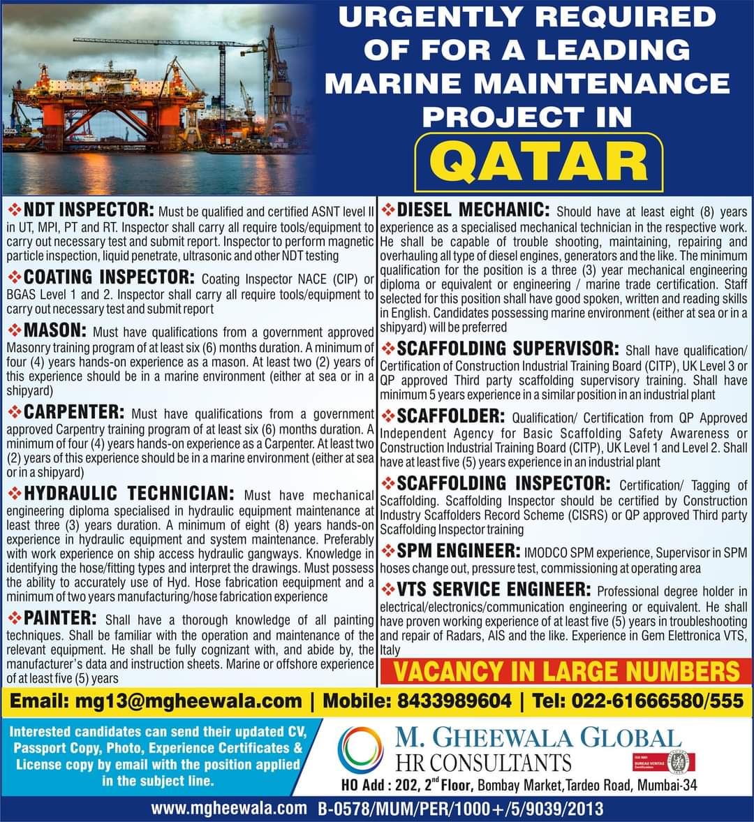 MASON: Must have qualifications from a government approved shipyard) will be preferred