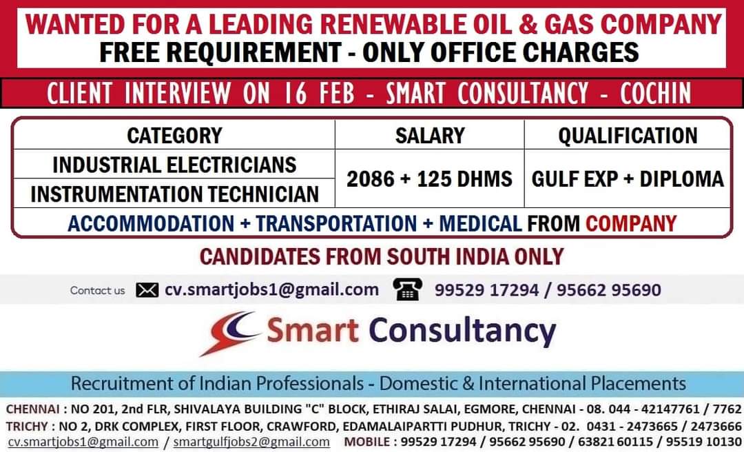 cv.smartjobsl@gmail.com / smartgulfjobs2@gmail.com MOBILE : 9952917294/ 95662 95690 / 6382160115 / 95